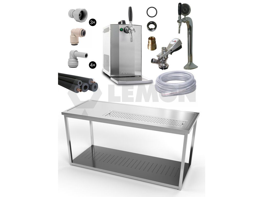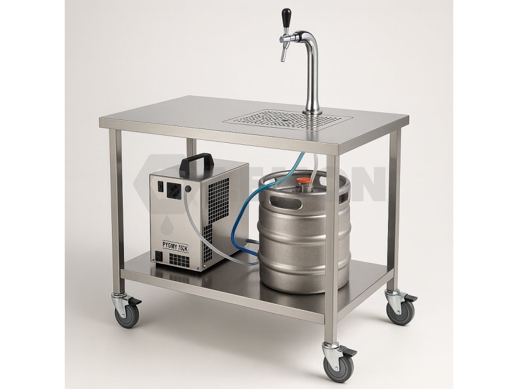 Celá technologie je umístěna na nerezovém výčepním stole z naší vlastní výroby, který je navržený pro mobilní a praktické použití při různých akcích nebo v domácím prostředí.